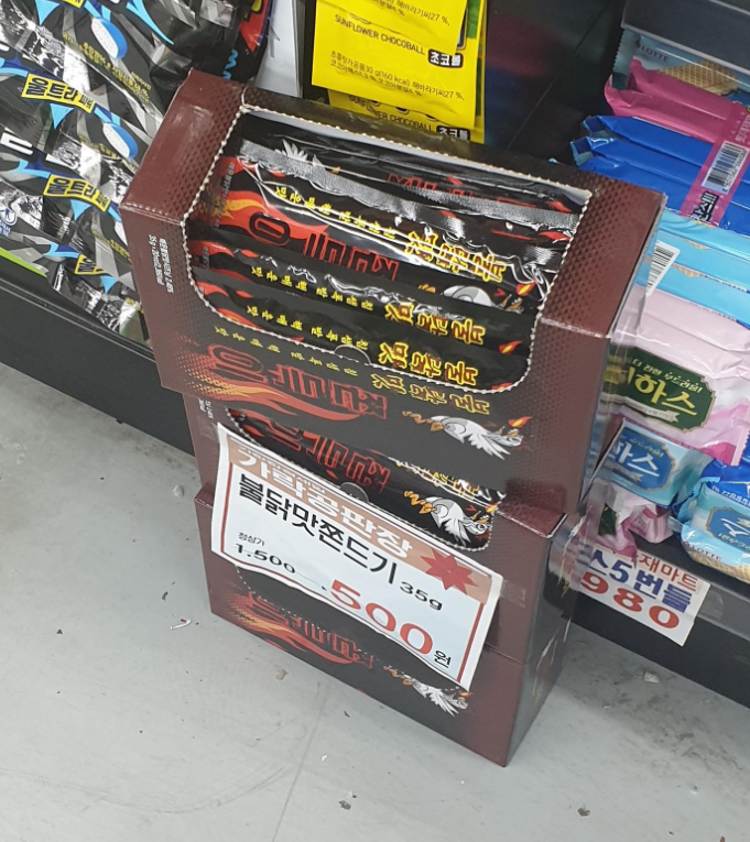 오늘 동네 마트에서 불닭맛 쫀드기라는 제품을 봤습니다. 정상가가 1500원은 아무도 안 살 것 같은데 할인가라는 이름의 평소 가격일 듯합니다.
