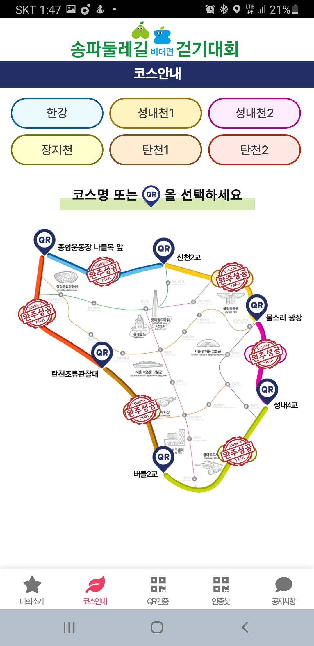 다니다보면 요런 현수막에 qr코드로 인증을 할때마다 완주로 표기되니 중간에 돌아가지않고 다채우자!!! 를 할수 있던것 같아요.