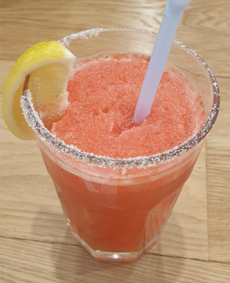 논알콜 푸룻 마가리타 스트로베리 맛은 테킬라 먹을 때 소금처럼 컵 가장자리에 설탕을 발랐더군요.