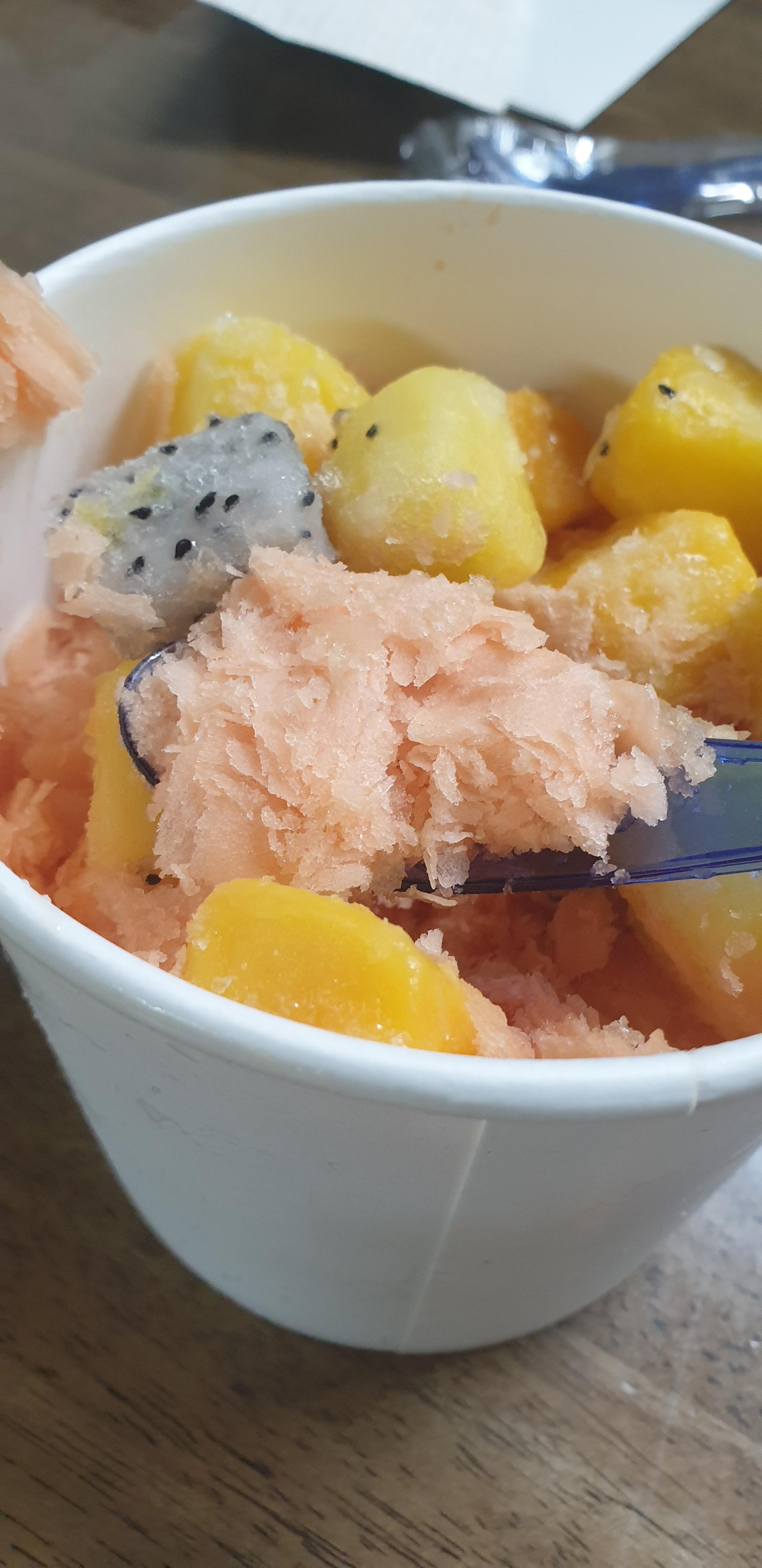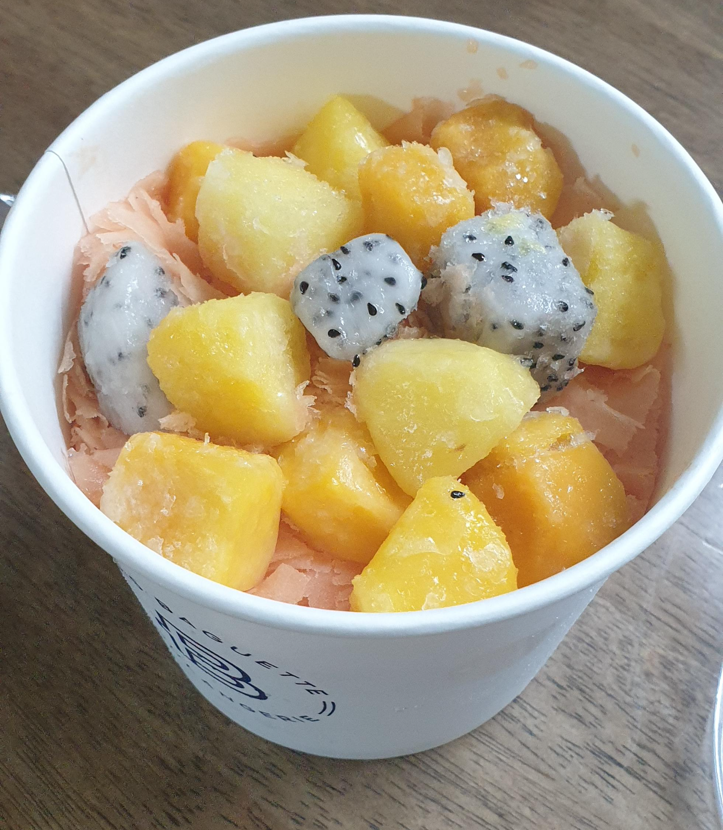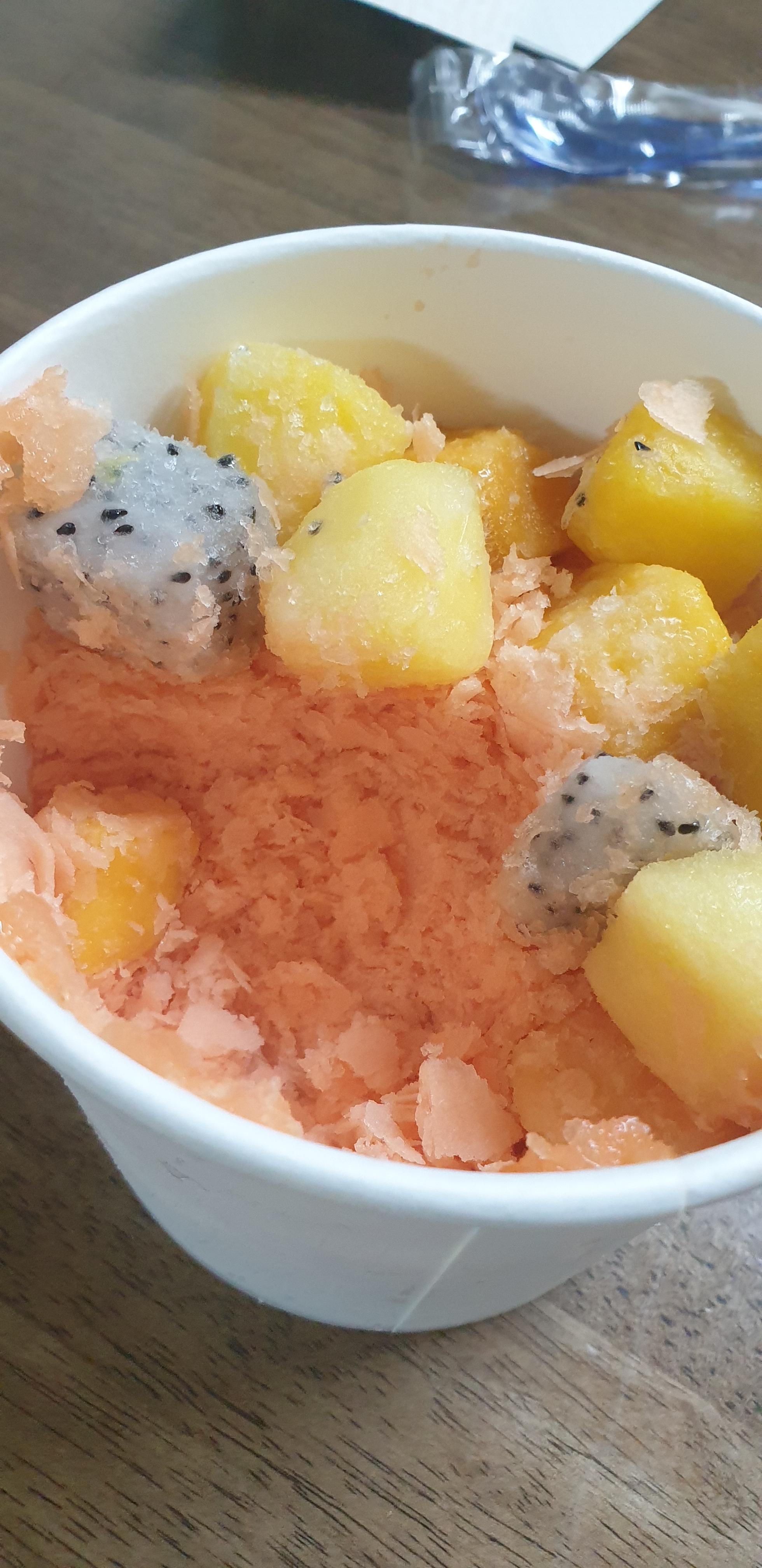 토핑으로 망고, 파인애플, 그리고 용과처럼 보이는 3종류 과일이 올라가 잇습니다. 얼음은 이미지처럼 자몽 색이고 맛도 자몽에이드? 써니텐? 같은 상큼한 과일맛이었습니다.